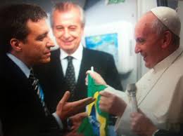 Ainda no avião que o conduzia de Roma até o Rio de Janeiro o Papa Francisco recebeu das mãos do repórter da TV Bandeirantes Márcio Campos uma bandeira do Brasil e uma relíquia de Nhá Chica.